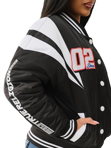 This True Religion Women's TR Satin Oversized Varsity Bomber Jacket - Jet Black | Zip-Up Bomber with Ribbed Cuffs combines elegant design with practical functionality. Every detail has been carefully considered to ensure you get the best possible experience. The high quality construction means this product will serve you well for years to come.