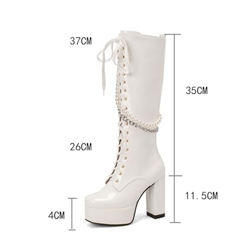 HOT ! Chunky Platform Knee High Heeled Boots, Pearl Chain Round Toe Big Large Size Lace-up Wide Calf Long Shoes 11.5cm
