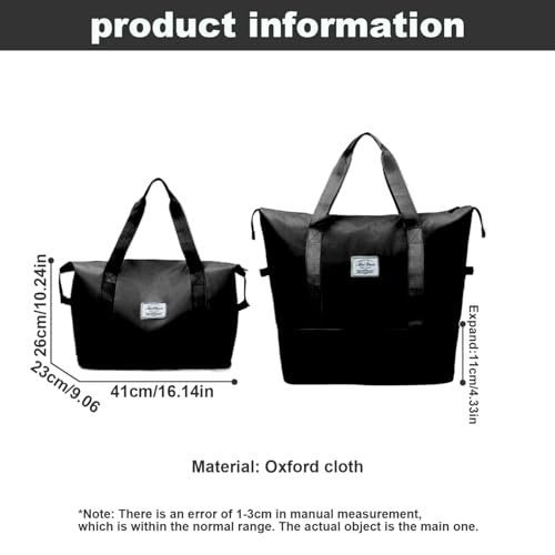 Waterproof and Durable: Made from quality waterproof Oxford cloth materials, our weekender bag ensures your belongings remain dry and protected during your travels, no matter the weather conditions. Its durable construction guarantees long-lasting performance.Foldable and Portable: Designed for convenience, this duffle bag comes with a extendable space for extra storage. The bottom storage is foldable, allowing you to pack it compactly when not in use. Easily stow it away in your luggage or storage closet, and take it out whenever you need extra storage space.Ideal for Various Activities: Whether you're traveling for work or leisure, hitting the gym, or embarking on a weekend getaway, this tote bag is your perfect companion. Its versatile design makes it suitable for a wide range of activities and occasions.Spacious and Organized: Our travel tote bag offers a large capacity with main large compartments, including an inner wet/dry separated pocket. Stay organized and keep your belongings easily accessible wherever you go, whether it's for travel or gym sessions.Stylish and Functional: With its sleek and modern design, this travel tote bag combines with functionality. Its chic appearance makes it suitable for both professional and casual settings, while its practical features ensure it meets all your travel and daily needs. Perfect for everyday use. High quality materials and excellent craftsmanship ensure long-lasting durability.