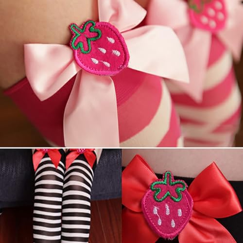 Women Stockings, Sweet Strawberry Bowknot Ribbed Over Knee Socks for Women Christmas Festivals Striped Thigh High 5