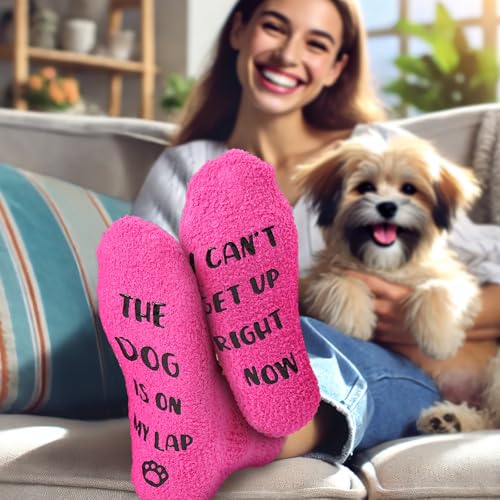• Funny Fuzzy Dog Socks: These hot pink fuzzy socks feature a unique design with the humorous message "I CAN'T GET UP RIGHT NOW, THE DOG IS ON MY LAP" and cute paw prints. They are perfect gifts for moms, dog moms, grandmas, stepmoms, pregnant moms, foster moms, and new moms, adding a touch of humor and warmth to their day.
