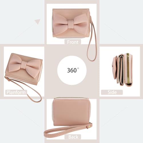HOT ! Small Wallet for Women, Trifold PU Leather Wallets with Zipper Coin Pocket and Multiple Card Slots, Cute Bow Credit Card Holder Coin Purse with Wrist Strap (Pink)