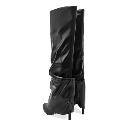 Women's Knee High Boots Fold Over Side Zipper Long Boots Pointed Toe Black White Women Dress Tall Boots for Women