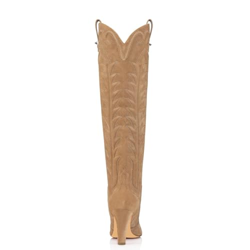 Women's Embroidered Knee High Boots Suede Block High Heel Western Cowboy Long Booties Pointed Toe Pull On Riding Boots for Women Ladies Fahion Dress Tall Boots 6