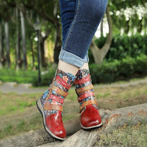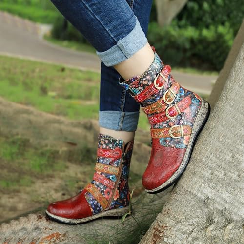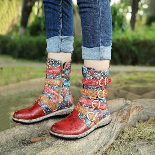More information about Socofy Leather Mid Calf Boots Autumn Winter Ankle Boots for Women, Riding Boots Vintage Side Zipper Short Boots Bohemian Floral Pattern Boots Outdoor Round Toe Flat Casual Antil Slip Comfort Walking