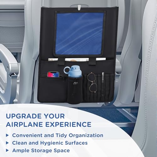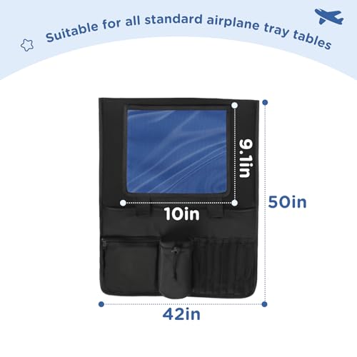 • All-in-One Airplane Seat Organizer: This airplane storage organizer with tray table cover combines a travel tray, tablet holder, and storage solution in one compact design. With handy pockets and a secure fit, it works seamlessly on planes, trains, or any transportation with tray tables—keeping essentials organized and within reach