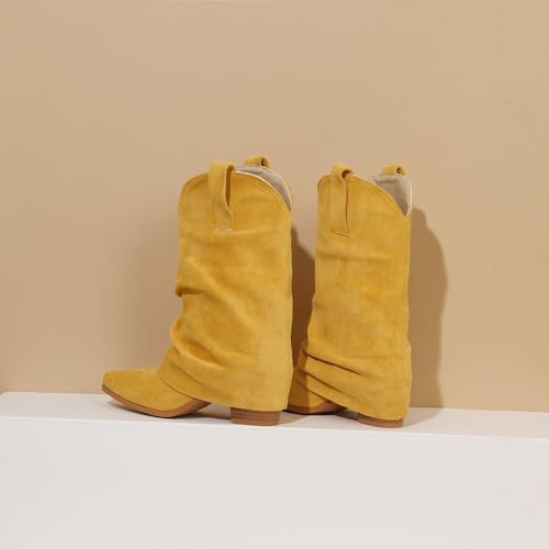 Fold Over Boots for Women Cowboy Boots Pull On Chunky Heel Pointed Toe Boots Western Cowgirl Casual Mid Calf Boots 7