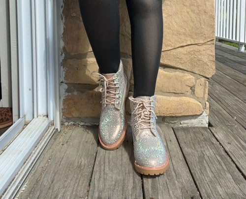 - Stay stylish and comfortable with these lace-up combat boots featuring rhinestone trim, round toe, and platform heels.