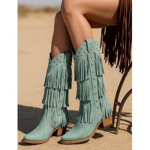 Yolkomo Cowboy Boots for Women Fringe Western Cowgirl Boots Pointed Toe Knee High