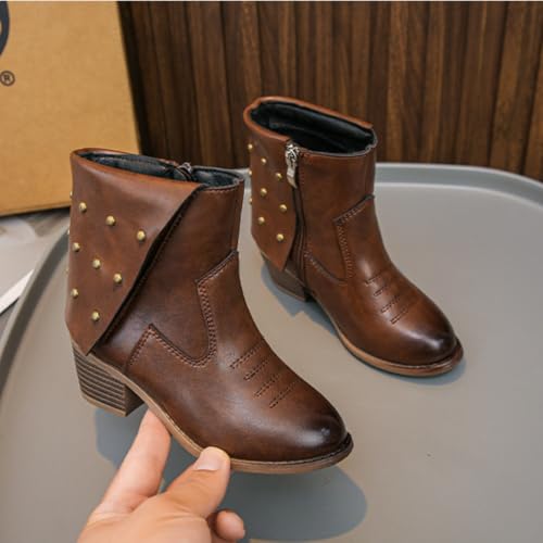 Girls Low Heels Cowgirl Cowboy Western Boots Rivet Mid Calf Booties Side Zipper Riding Shoes 5