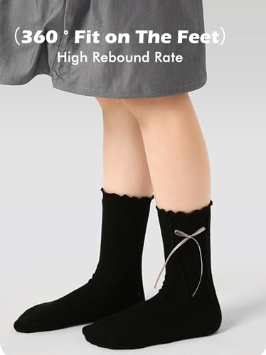 Girls Socks Crew Socks Mid-Calf Ruffed Lace Cuffs Bow Ribbed Lines Design Solid Fashion Socks for Girls 1 Pair 6
