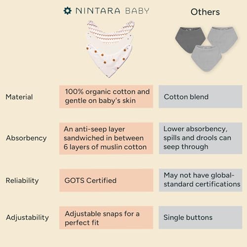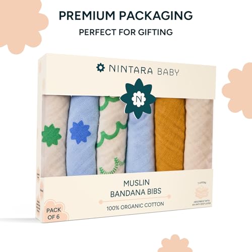 Fabric type: 100% CottonCare instructions: Machine WashOrigin: ImportedMUSLIN BANDANA BIBS: Keep your little one dry, clean, and comfortable with Nintara Baby's extra-soft bandana bibs. Made from 100% organic cotton muslin with a seep-proof middle layer, they’re gentle on your baby's sensitive skin while providing added protection.INCLUDES: A pack of 6 bandana bibs (15.5 x 9), featuring three playful prints and three solid colors, plus a convenient drawstring bag for mess-free travel.PREMIUM QUALITY: Crafted with 6 ultra-soft layers of organic cotton muslin and a waterproof middle layer. Hypoallergenic, breathable, and gentle enough for all-day wear.SUPERIOR ABSORBENCY: Feeding and teething can get messy, our seven-layer system with a seep-proof core ensures your baby stays clean and dry throughout the day.ADJUSTABLE SNAPS: Designed with two secure snaps for a customizable fit that grows with your baby from newborn to toddler.EASY CARE & DURABLE: Machine washable and made to last, these bibs get softer after every wash, making them a practical choice for daily use. Perfect for everyday use. High quality materials and excellent craftsmanship ensure long-lasting durability.