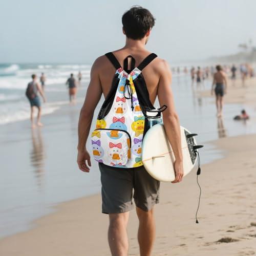 HOT ! Cartoon Duck Bowtie White Drawstring Gym Backpack for Men Women Pull String Sports Swim Bag with Mesh Pocket & Adjustable Strap Beach Backpack for Travel Outdoor Swimming