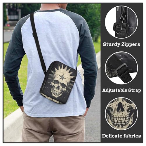 Skull with Star Sling Bag Zipper Closure Crossbody Messenger Bag with Card Phone Passport Compartment 6.6×9.4×2.5 inches 6
