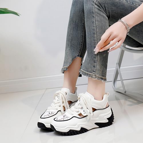 Women's Leather Hollow Increasing Platform Casual Sneakers Lace Up Non-Slip Shock Absorbing Heighten Hiking Shoes Summer Fashion Round Toe Breathable Dad Shoes 6