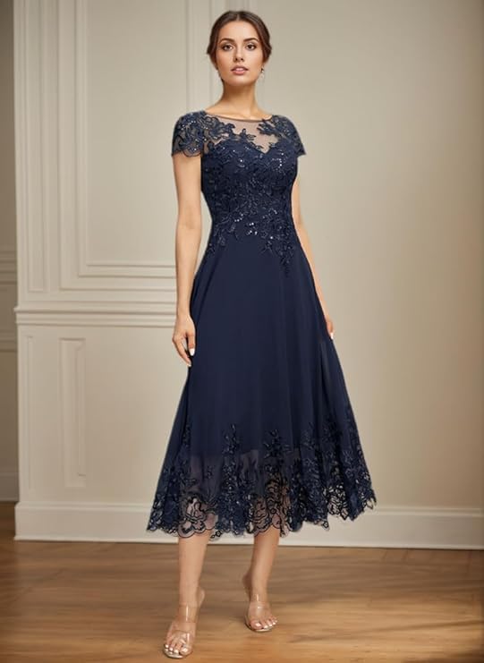 Mother of The Bride Dresses for Wedding Tea Length Short Sleeves Lace Chiffon Formal Dress for Women 1