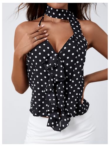 Why Choose MakeMeChic Women's Polka Dots Halter Top Ruffle Backless Going Out Top with Scarf?