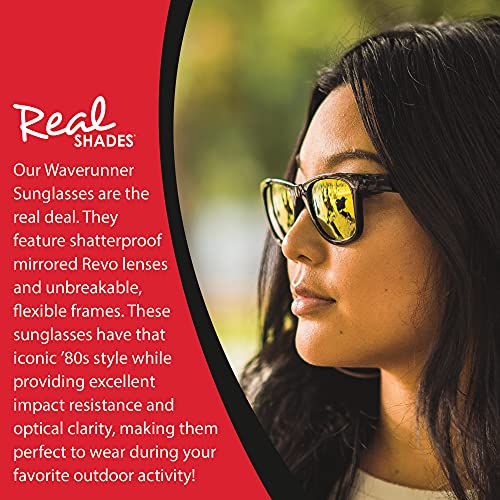REAL SHADES SUNGLASSES: Our women’s and men’s stylish sunglasses are durable and fun, functional and fashionable. They're designed with top-quality materials to give you the protection and comfort you need to wear them all day long. You’ll never need another pair of eye-protection glasses again.STYLISH COOL SUNGLASSES: Our Waverunner sunglasses are the real deal! They feature the colorful retro styling of classic vintage ’80s sunglasses. You are sure to be the envy of everyone when you’re rocking these mirrored shades during your favorite outdoor activity!UNBREAKABLE FRAMES & SHATTERPROOF LENSES: Lightweight, shatterproof polycarbonate mirrored lenses provide impact resistance and clarity. The sturdy frames on these cool sunglasses are bendable, but they won’t break! These are flexible, durable, unbreakable sunglasses that are comfortable enough to wear all day!100% UVA/UVB PROTECTION: Our stylish mirrored shades aren’t just fashion-forward cool glasses. They’re also specifically designed to protect your eyes. They offer 100% UVA/UVB protection to keep eyes safe from damaging rays. Think of our eyewear as sunscreen for the eyes!THE REAL SHADES MISSION: Since 2002, we’ve made it our mission to protect as many eyes as possible from the damaging effects of UV radiation by specializing in stylish, fun sunglasses with unbreakable frames and premium ophthalmic-quality lenses. Perfect for everyday use. High quality materials and excellent craftsmanship ensure long-lasting durability.