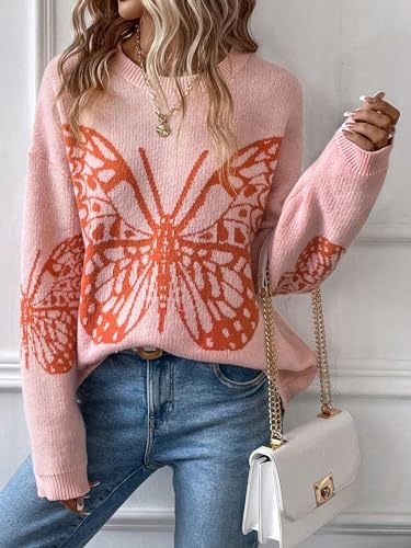 - Feature: Long sleeve, round neck, drop shoulder, butterfly pattern, oversized sweater top