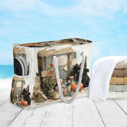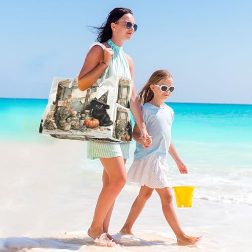 Large Beach Bags Totes Canvas Tote Shoulder Bag Black Cat Magic Books Water Resistant Bags for Gym Travel Daily 5