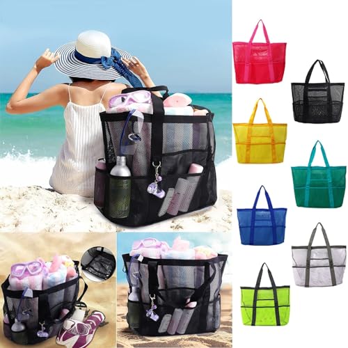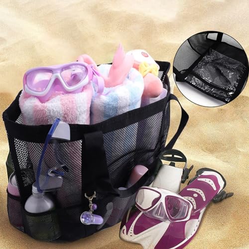 • Large Capacity & Multi-Pocket Design: This beach toy storage bag features a spacious main compartment and multiple pockets, perfect for organizing sand toys, towels, sunscreen, and other beach essentials