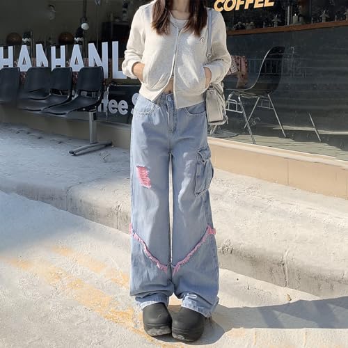 • Design: Gothic grunge fashion jean pants for women, with pink ripped and frayed raw trim, loose straight wide leg style y2k jeans for women.