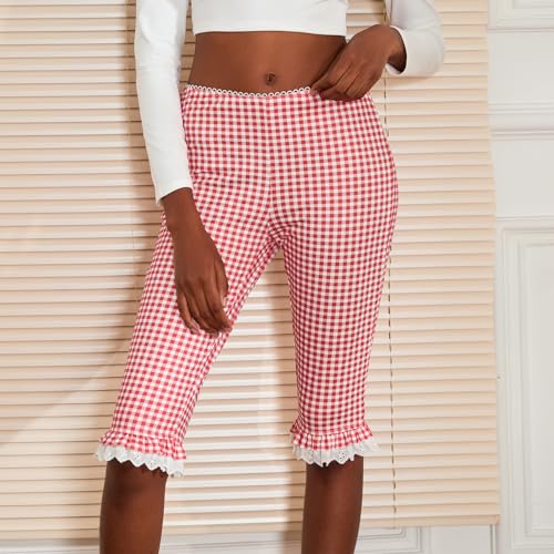 Women Plaid Capri Pants Summer Elastic Waist Knee Length Lace Ruffles Hem Skinny Casual Capris Legging 6