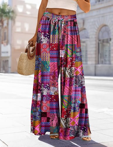 Fabric type: 100% CottonClosure type: Pull OnRise style: High RiseLeg style: WideFeaturing captivating floral or geometric patterns that scream summer fun, stunning bohemian pants turn heads everywhere you go, beach, vacation, cruise, cocktail, party, shopping, lounge, dinner, night out. For someone who prefers simple and relaxed life, we specially offer solid colors.With a trendy design and a loose fit, these palazzo pants offer both style and comfort. While increasing the sense of design, paperbag high waist with wide elastic and drawstring is figure-flattering, whether you are curvy or petite. March in light pace with hands putting in the pockets, side split wide legs of baggy pants flow along with the gentle breeze.Made of 100% cotton fabric, these flowy trousers are soft and airy, comfy enough to lounge all day in, especially on those hot summer days. In the season perfect for embracing the nature, dress on your lightweight outfits and rush to freedom with relaxation and comfort.Women casual pants are versatile garments that can be styled in different ways. They can be paired with various tops, such as t-shirts, blouses, or coats, allowing you to create different looks for different occasions. Easily dress them up or down. They are perfect choice for the fashion-forward woman who wants to make a statement.Garment Care: Hand wash or machine wash cold. Avoid the dryer to prevent shrinkage and hang or lay flat to dry. Low ironing if necessary. Do not bleach. Perfect for everyday use. High quality materials and excellent craftsmanship ensure long-lasting durability.