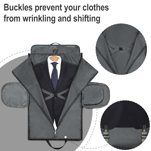 Large Capacity Versatile Garment Bag: This large sized carry on duffel garment bag is great for personal and business trip. Various inner pockets to organize apparel, suits, dress, electronics, toiletries, cosmetics and travel essentials. Multiple external zippered pockets for quick access to smartphone, IDs or passport. A dry wet separation expandable shoe pouch includedNo Wrinkle Hanging Garment Bag: Combine the feature of garment bag and travel duffel bag, open this garment bag and lay it flat, it can be a hanging garment bags for travel or in your closet. The built-in garment hanging pocket with buckle strap ensures formal wear, suit or dress will always stay neat without wrinkles and deformationWaterproof Shoes Pocket: Keep your shoes, wet/dirty clothes organized and separated from other belongings with our side zippered expandable pocket which is separated from the main compartment of the duffel garment bag. Build with air hole outside to avoid unpleasant smell. Made of water-resistant material of the shoe pouch can be easily wiped clean and totally separated the dry and the wetCarry On Friendly Design Garment Bag: Back side sleeve design make it easily slide this bag onto the handle of suitcase trolley. Four supporting corners at the bottom of the garment bag, avoid lifting the ground directly when placing bags. Multiple carry options, comes with adjustable & detachable soft-padded straps (length range:26-48) allowing you to easily switch between carrying the bag over your shoulder or use it as a handbag, garment bag, duffle bag anytimeHigh Quality Duffel Garment Bag: Made with ultra durable polyester fiber, this waterproof travel garment bag is scratch-resistant, anti-tear, strong enough to pack heavy items. Comfortable PU handles, rainproof smooth zipper, perfect for the modern traveler looking for style and functionality. This convertible 2 in 1 garment bag set has everything you need for travel. GARMENT BAG Dimension: 37.5”L x 20.8”W, DUFFEL BAG Dimension: 22.8”L x 11”W x 11.8”H. The garment bag also folds down for easy storage Perfect for everyday use. High quality materials and excellent craftsmanship ensure long-lasting durability.