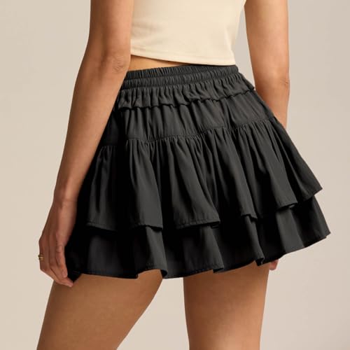 Women Casual Ruffle Mini Skirt Solid Color High Waisted Flowy Tiered Short Skater Skirts for Autumn Winter 2