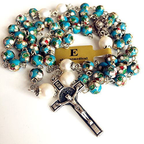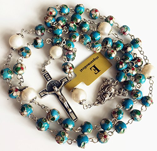 Why Choose elegantmedical HANDMADE NICE Blue CLOISONNE & 10mm Pearl BEAD ROSARY NECKLACE Italy St.Benedict cross Box?