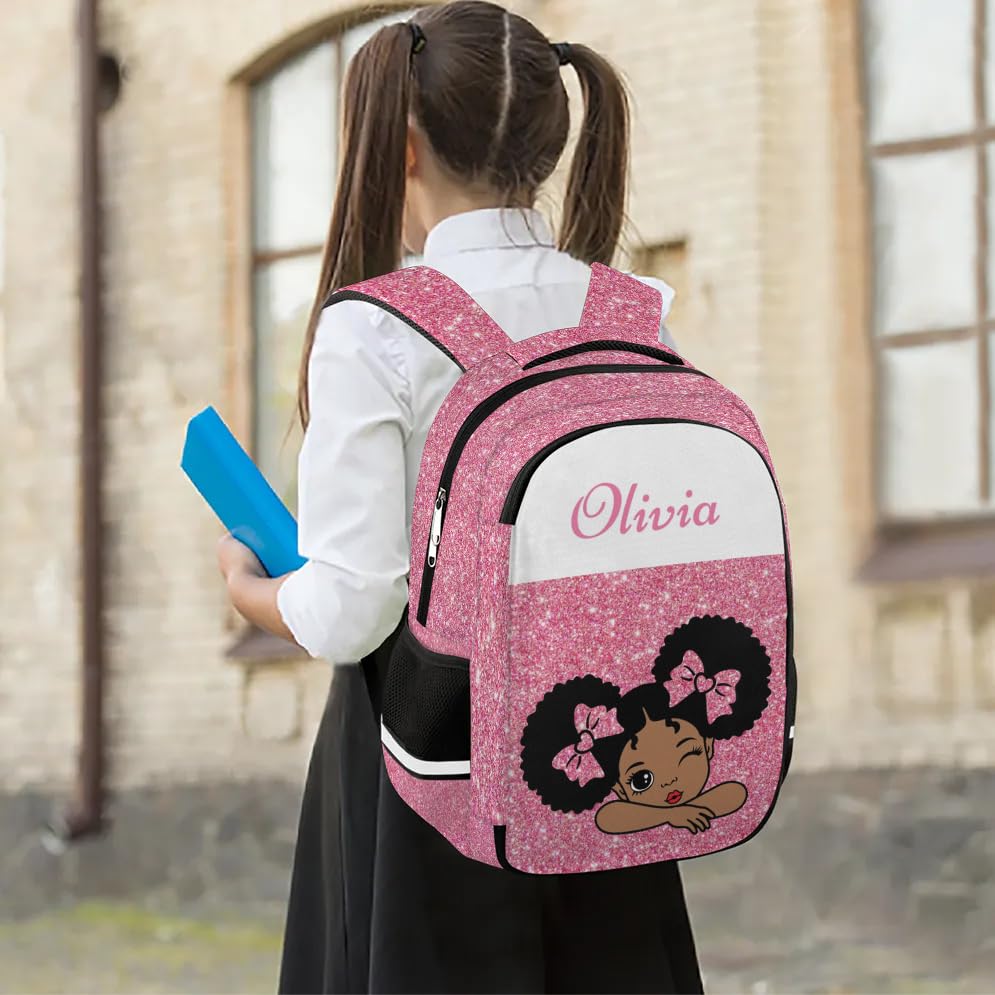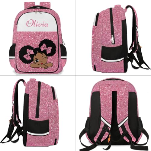 African Girl Personalized Kids Backpack for Boys Girls, Pink Glitter Print Custom Backpack Travel School Bag Bookbag Lightweight Daypack