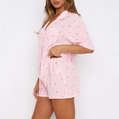 XBTCLXEBCO Women Valentines Pajama Sets Heart Print Short Sleeve Button Down Tops and Shorts 2 Piece Pjs Set Loungewear 4