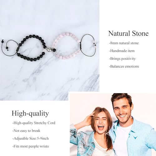 Material: BeadMetal type: No Metal TypeClasp type: No clasp typeChain type: Bead ChainGem type: No gemstoneCouple Bracelets:Our Couple Matching Bracelets are made from natural beads. This material is not only suitable for both men and women but also promises durability and longevity. The natural beads is resistant to wear and tear, ensuring your bracelet will maintain its beauty over time.Meaningful Gifts:You will get 2 bracelets, a jewelry gift bag, a sweet message card, a blank greeting card and envelope.Whether you're looking for Christmas Birthday Valentines Day Anniversary gifts, this products offer something special that will be cherished by anyone who receives it.Convenient Storage: The set comes with a velvet bag, making it easy to store and protect your jewelry when not in use. The velvet material is soft and gentle on the jewelry, preventing scratches and other damage. The velvet bag also makes it easy to wrap and give as a gift, making it a thoughtful and practical Christmas or Valentine's Day present for any occasion.Meaningful Message Card: Each bracelet set is accompanied by a heartfelt message card. This card provides a space for you to express your feelings and sentiments towards your partner, adding a personal touch to this gift. Whether it's an expression of love, friendship, or appreciation, this message card is sure to make your gift even more special.Lightweight and Comfortable: With their lightweight design, these bracelets are easy to wear throughout the day, making them a versatile accessory for personal use or for sharing with loved ones. Perfect for everyday use. High quality materials and excellent craftsmanship ensure long-lasting durability.