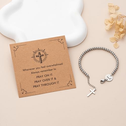 Initial Cross Silver Bracelets for Women Trendy, Initials Cross Charm Beaded Bracelet, Christian Gifts for Women, Baptism Confirmation Christmas Inspirational Gifts for Mom Daughter Friend Sister
