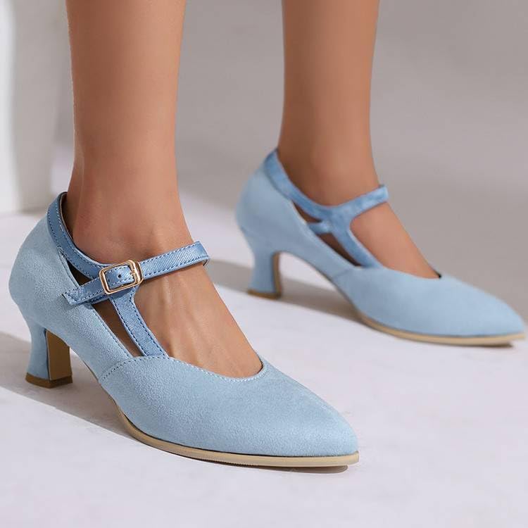 Women Vintage Mary Jane Shoes Pointed Toe Pumps Spool Heels with Belt Buckles