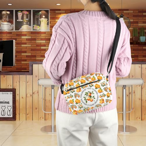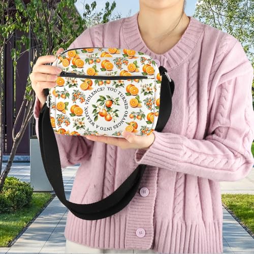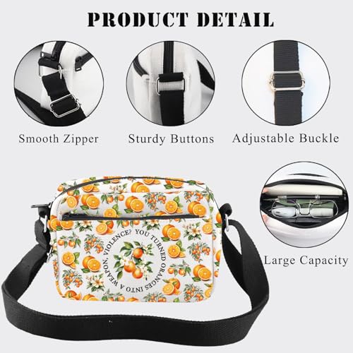 Origin: ImportedClosure type: ZipperBag with Quote: YOU TURNED ORANGES INTO A WEAPON, VIOLENCE? It’s a perfect gift for Dragon Lover, Book Lover, Bookish.Size measurement: 24.5cm (9.65inch) * 18cm (7.09inch). PS: Please allow for slight differences caused by manual measurement. Material: Made of high-quality canvas, smooth zipper to protect items from falling off easily. Double sided color printing, well made, with beautiful and colorful graphics. Waterproof coating, easy to clean, so there is no need to worry about residual stains.Storage space: There are a total of 3 pockets for storing your essentials, including mobile phones, wallets, keys, sunglasses, snacks, jewelry, electronic accessories, cameras, toiletries, medical supplies, personal items, etc.Applicable scenarios: You can use our crossbody bag while walking, cycling, biking, camping, traveling, hiking, and more. And it has many ways to wear it, whether you're commuting, traveling, or hiking, this bag can meet your needs.Meaningful Gift: A great gift to express gratitude. Perfect as a graduation gift, thank-you gift, birthday gift, Thanksgiving gift, Christmas gift, New Year's Eve gift, year-end gift, or just to express your concern! Perfect for everyday use. High quality materials and excellent craftsmanship ensure long-lasting durability.