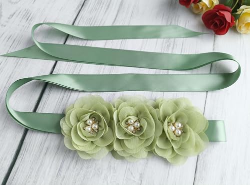 Flower Girl Sash Sage Green Flower Girl Sash Belt for Dress, Chiffon Pearl Floral Sash Belts for Bridesmaid/Bride Dresses 1