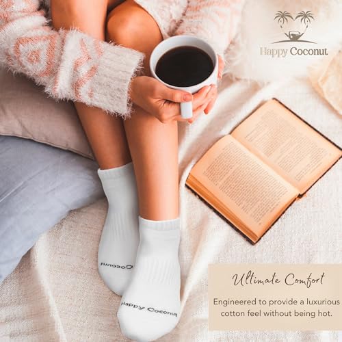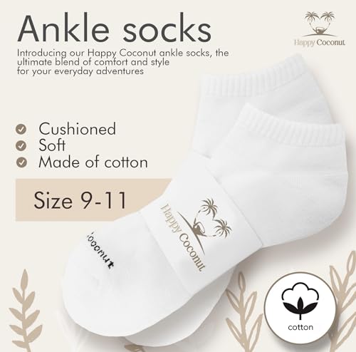 More information about Happy Coconut White Cotton Ankle Socks- Unisex Size 9-11 | Soft, Breathable, Moisture-Wicking Everyday Socks for Men & Women | Durable, Lightweight, Odor-Resistant Athletic Socks (6 Pack)