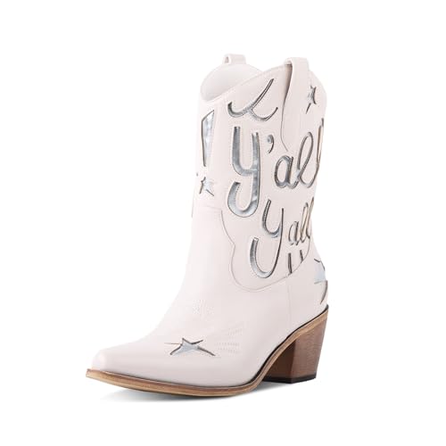 Cowboy Boots for Women Metallic Mid Calf Booties with Stars Western Cowgirl Fashion Embroidery Short Boots with Chunky Low Heel Party Shoes Cocert Outfits 7