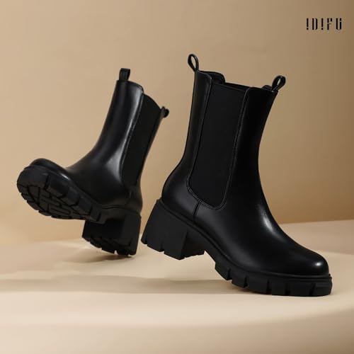 IDIFU IN2 Chelsea Ankle Boots for Women Low Short Block Chunky Heel Mid Calf Slip On Lug Sole Platform Fall Dress Booties Ladies Fashion Comfortable Casual Cute Trendy Elastic Thick Boots