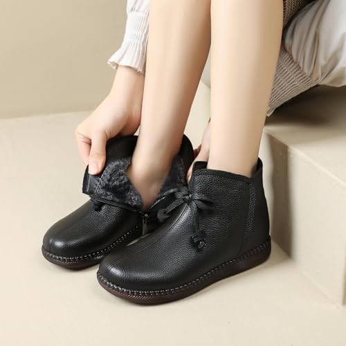 Women's Genuine Leather Bow-Knot Flat Ankle Boots Retro Velvet Lining Round Toe Side Zipper Beef Tendon Sole High Top Casual Shoes Comfortable Warm Walking Booties