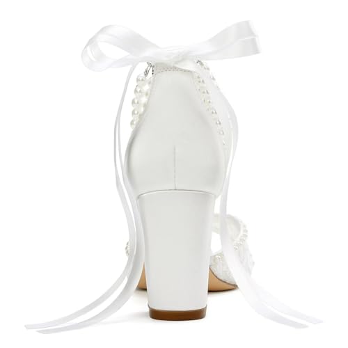 Lace Wedding Shoes for Bride Pearl Heels Bridal Shoes Block Heel Wedding Sandals 5