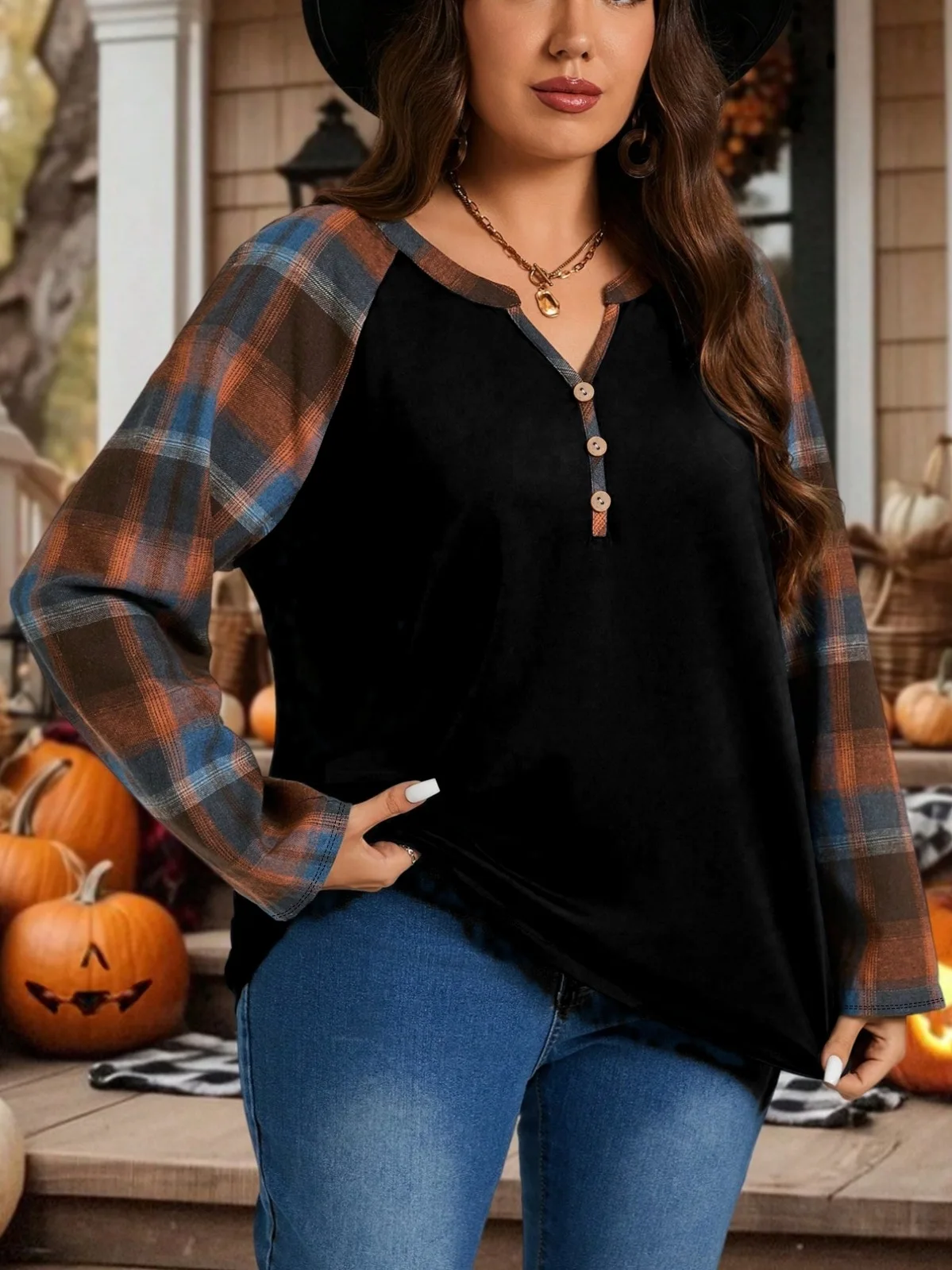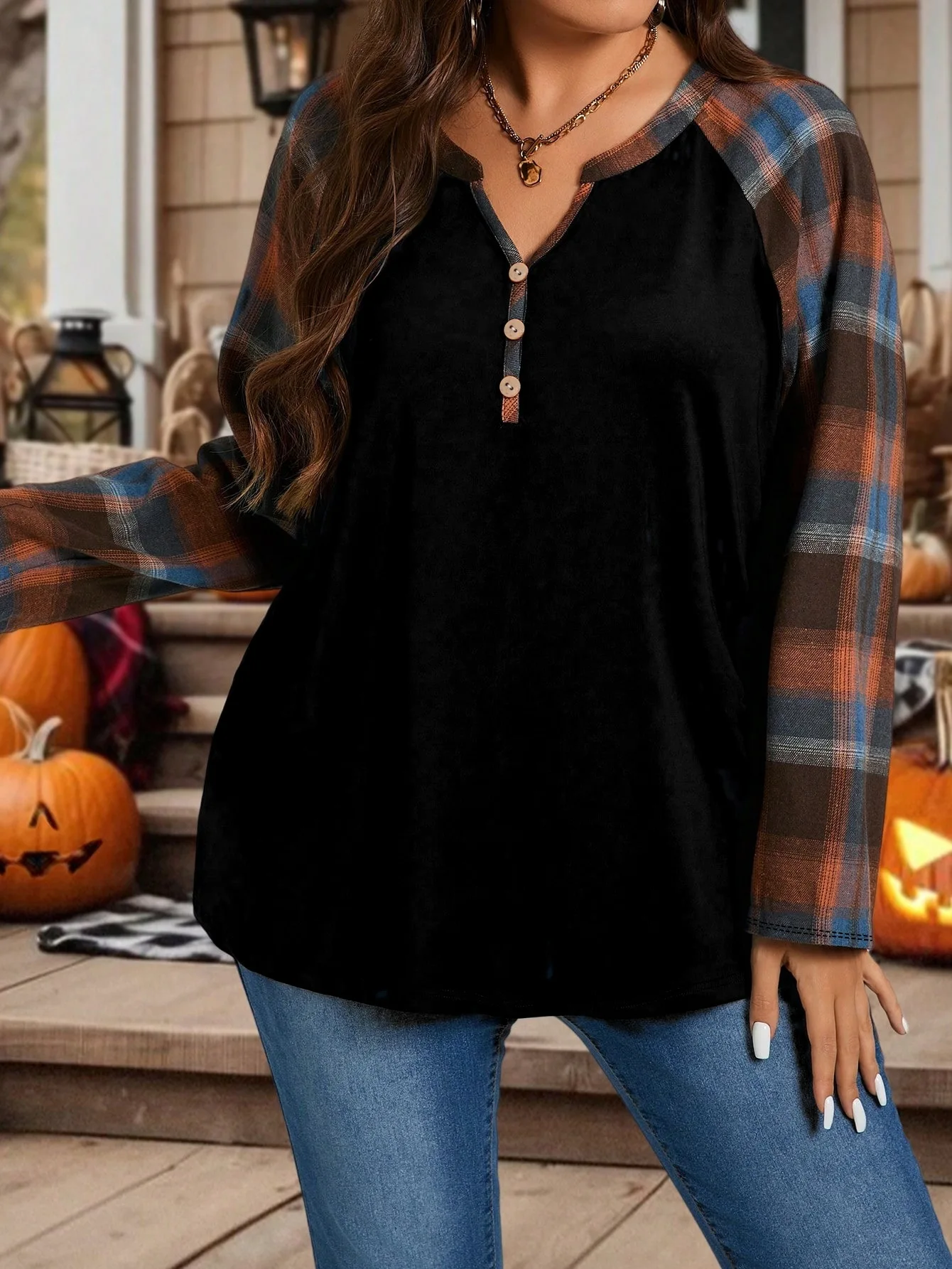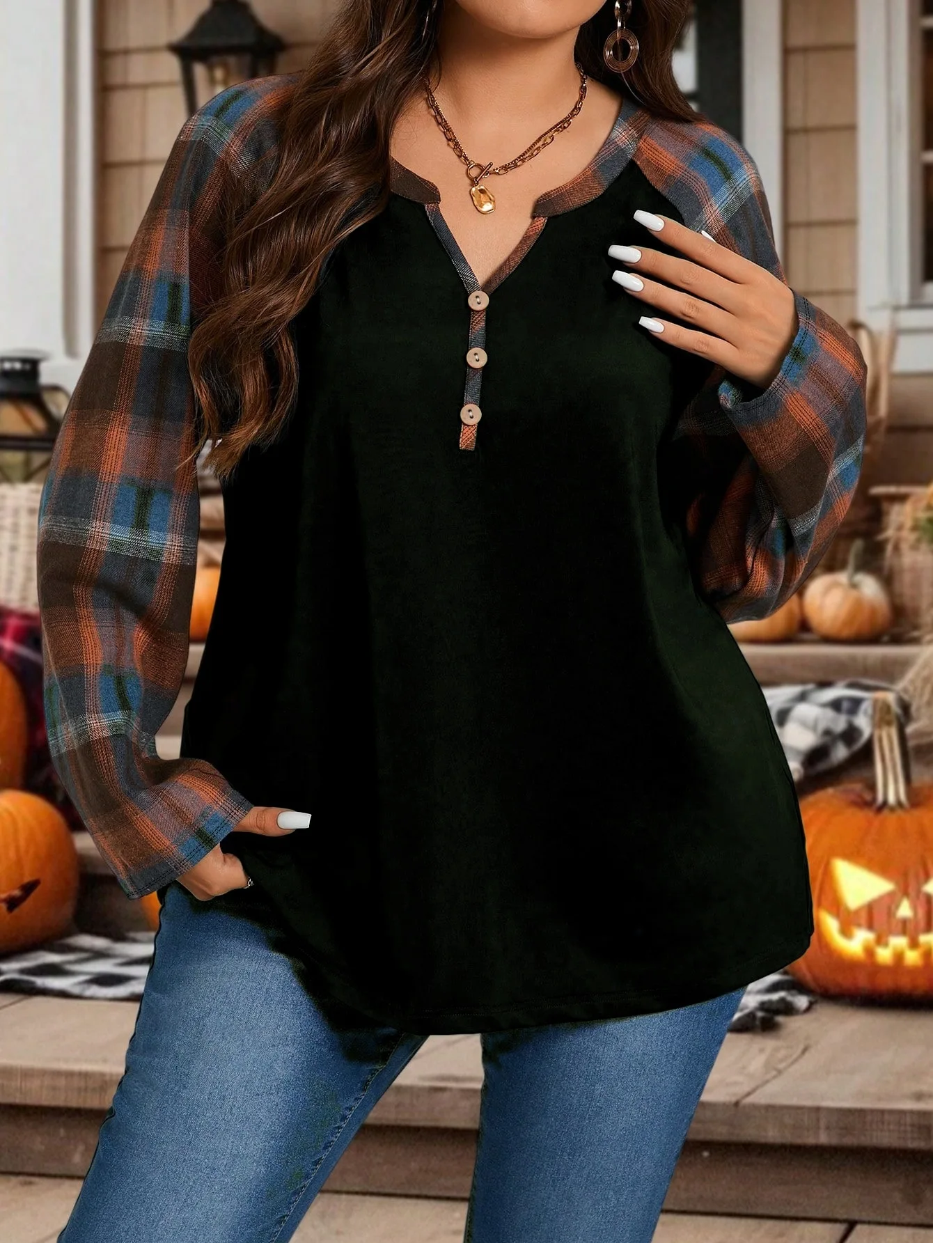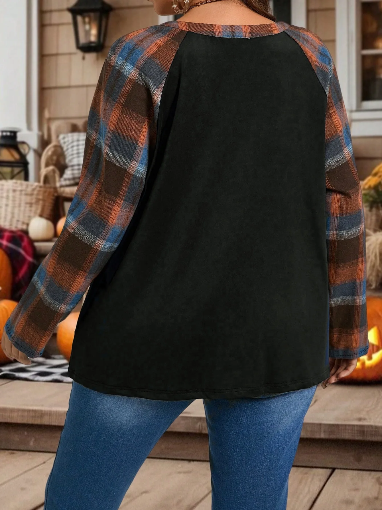 Plus Size Women's Plaid Splicing Long Sleeve Fashion Casual Top