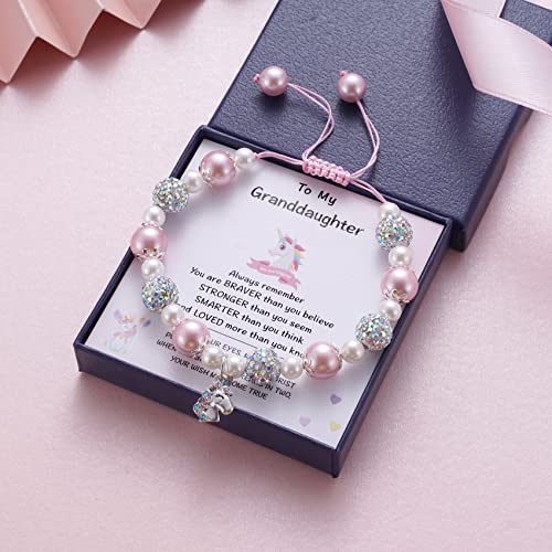 Material: Rhinestone, CrystalMetal type: ZincClasp type: DrawstringChain type: Rope ChainGem type: No gemstoneItem type name: Bracelets*Sparkly Unicorn Pink Bracelet for Granddaughter* This cute charm bracelet combined with sparkly rhinestone crystal balls, pink & white pearls and unicorn charm, which make your granddaughter more eye-catching in the crowd. It is an adjustable bracelet and it slid to fit your granddaughter wrist perfectly, unicorn bracelet adjustable from 4 to 11.*To My Granddaughter Magical Bracelet from Grandmom Granddad* Accompanied with a meaningful message card: To my granddaughter, always remember you are braver than you believe, stronger than you seem, smarter than you think and loved more than you know. Close your eyes, make a wish, put this bracelet on your wrist, when the bracelet breaks in two, your wish may come true. Wear this bracelet to feel love and happiness, and good luck will follow you.*Carefull Packaged Gift Ready for Her* The sparkly and lovely unicorn bracelet comes with a gift box and a blank card. You can write some of your blessings to your cute granddaughter and put it in the envelope, tell her you are magical and unique, and I will Love You Always.*Unicorn Gifts for Granddaughter* The unicorn is the magic symbol in granddaughter's hearts. Give your granddaughter this magical unicorn rhinestone bracelet may bring her good luck and make all her wishes and dreams come true.*Sweet Unicorn Gifts Fits Most Occasions* Suitable for birthday party, Easter, Thanksgiving, Halloween, Christmas, Valentine's Day, back to school, graduation or any special moment. Perfect for everyday use. High quality materials and excellent craftsmanship ensure long-lasting durability.