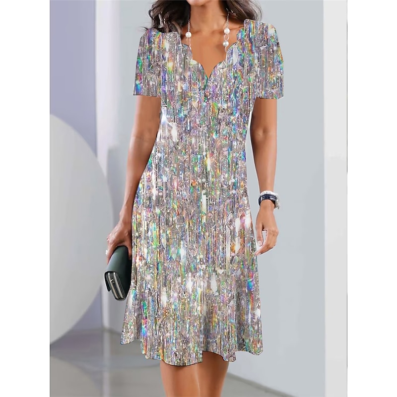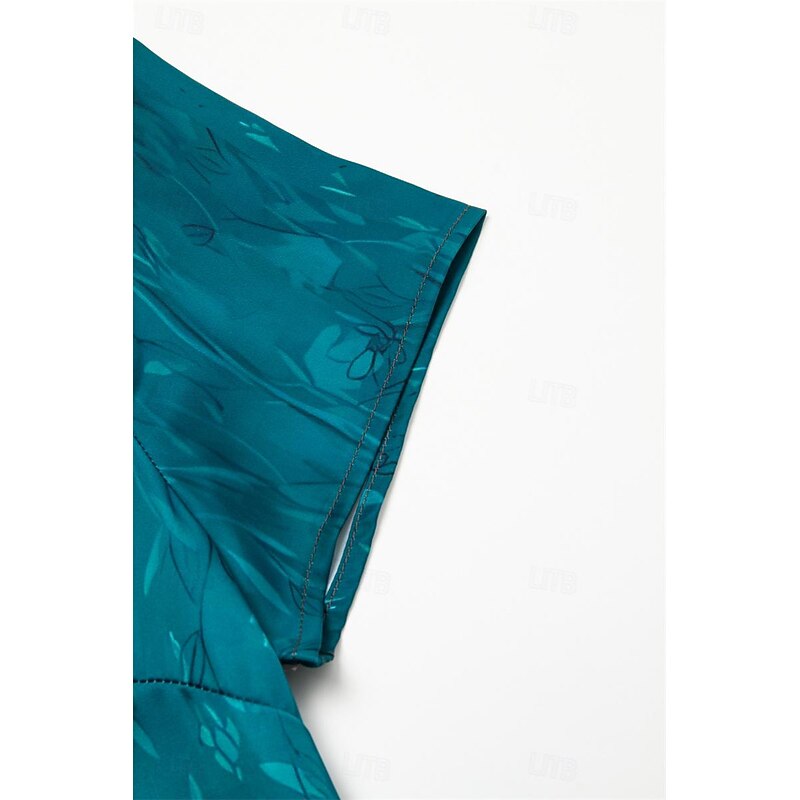 : The dress features a loose fit and an elegant A-line silhouette that falls to a midi length, providing an effortlessly flattering shape for a variety of body types. Its short sleeves and knee-length skirt make it both stylish and practical.