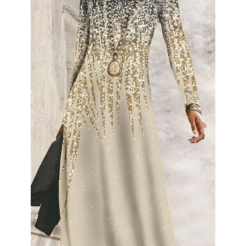 Showcasing a stunning ombre print, this dress transitions beautifully from dark to light hues. The round crew neck and long sleeves contribute to a sophisticated and timeless design, while shimmering sequins on the top add a subtle touch of glamour.