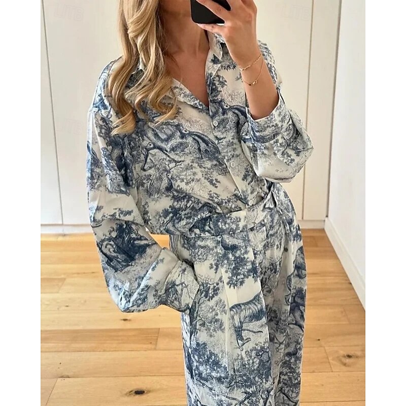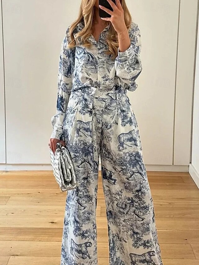 HOT ! Women's Active Fashion Shirt Blouse Pants Sets Long Sleeve Shirt Collar Floral Print Outdoor Vacation Blue Fall Regular Fit