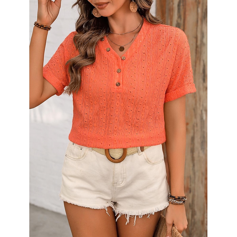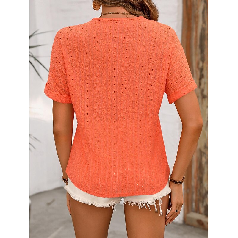 Women's White Elegant Lace Tops Eyelet Blouse Fashion Plain Regular Tops Short Sleeve V Neck Lace Regular Fit Vacation Daily Romantic Petite Tops Summer Holiday Wear Black White Orange Summer