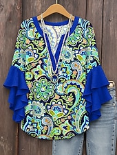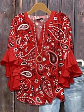 More information about Women's Retro Blouse Layered Ruffle Sleeve Tops Vintage Floral Graphic Paisley Bohemia Vintage Daily 3/4 Length Sleeve Regular Tops Daily Holiday Vacation Wear Print White Red Blue Green